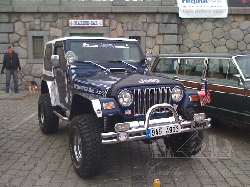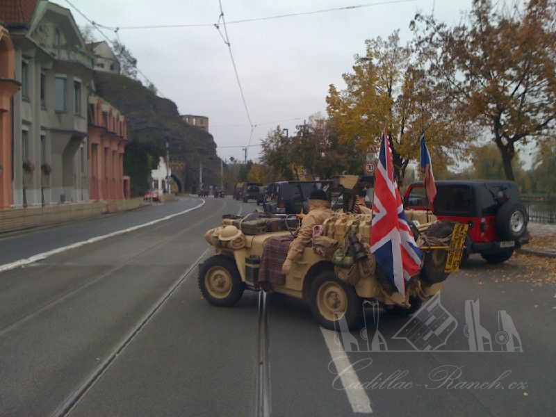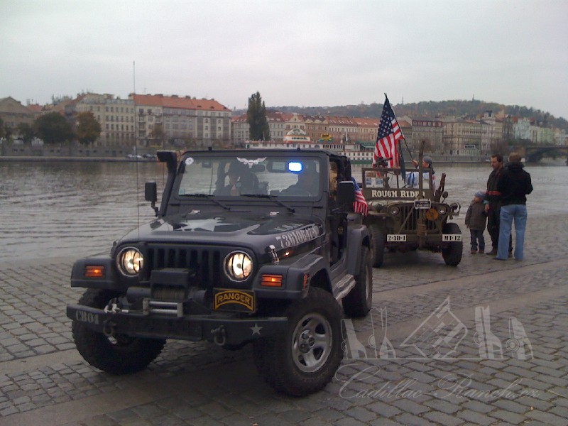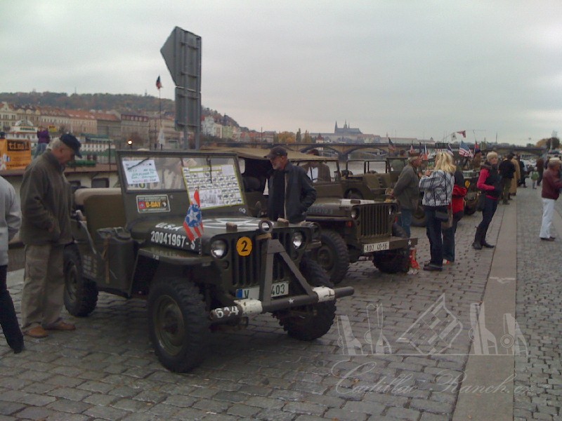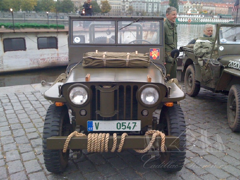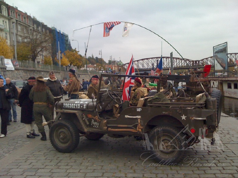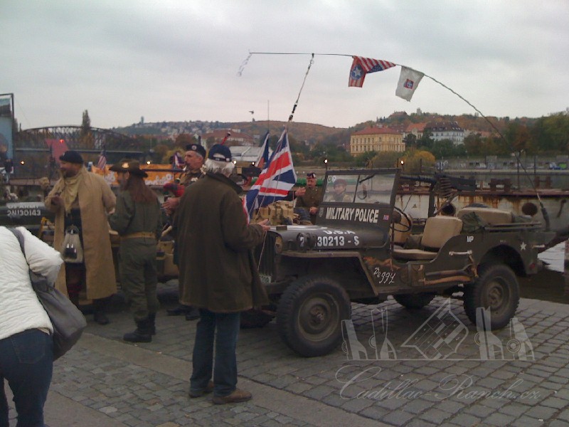 Každopádně to byl jeden z důvodů proč se Cadillaci vydali juknout na oslavy společnosti Jeep. Jeep se zapsal do automobilové historie tučným písmem a stejně tučné byly i oslavy začínající v Praze na náplavce u Palackého mostu. Sjelo se zde 110 Jeepů. Početná byla skupina původních vyznavačů armádních Jeepů, tj. Jeep Willys MB. Kulomety a uniformy byly povinnou součástí všech, kteří přijeli v nebo na těchto veteránech. Švanda Dudák tu sice nebyl, ale dudy zde byly slyšet docela zřetelně. Kvílely a kvílely… nebo mečely? Každopádně se každé takové vystoupení setkalo s bouřlivým potleskem. Ve 12 hodin začal hon na lišku. Že by přijel generál Erwin Rommel? Ale ne! Jen zde byl po zuby ozbrojený zástupce Jeep Willys MB v pouštní úpravě. Kolona vyrazila a tím oslavy pro Cadillaky skončily. Pro ostatní oslavy začínaly a pokračují až do neděle.