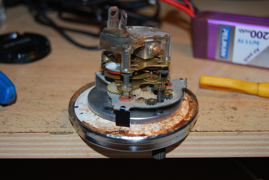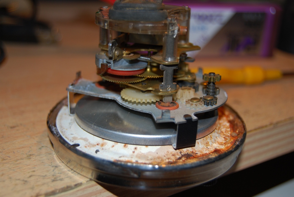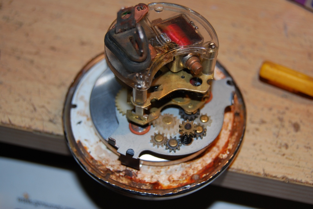 Po chvilce studia jsem přišel na to, že cívka slouží k natahování, když kolečko dojede k dorazu, sepne a cívka kladívkem ťukne, čímž odrazí kolečko, které se natáhne. To pak dál hýbe hodinovým strojkem. Strojek vypadal v pořádku, ale i když bylo nataženo, nechtěly hodiny jít. Když jsem zatlačil na kolečko, a snažil se simulovat silnější pružinku, hodiny se rozeběhly, ale jen na chvilku dokud jsem tlačil. Pružinka nevypadala opotřebovaná, tak jsem zkusil hodinářskou fintu – olej. Hodiny se rozeběhly Pokud nebyly přes 30 let namazané, měly na to už nárok. Skříňka hodin byla zrezivělá, asi tam někde natekla voda, tak jsem to obrousil a přetřel základovkou. Hodiny jsem nařídil, tak jsem zvědav, jestli se budou zas předcházet.