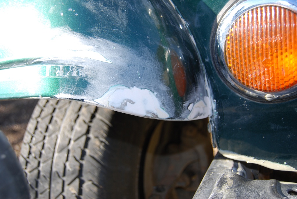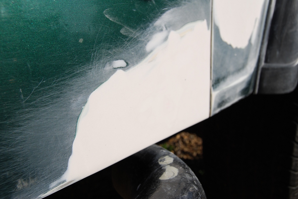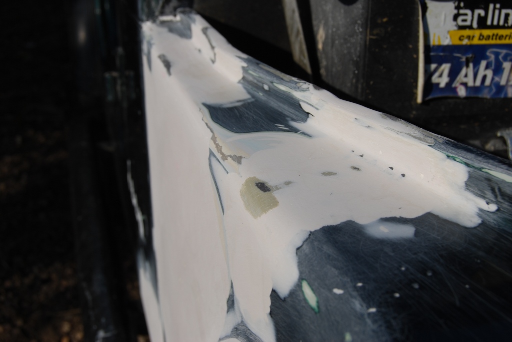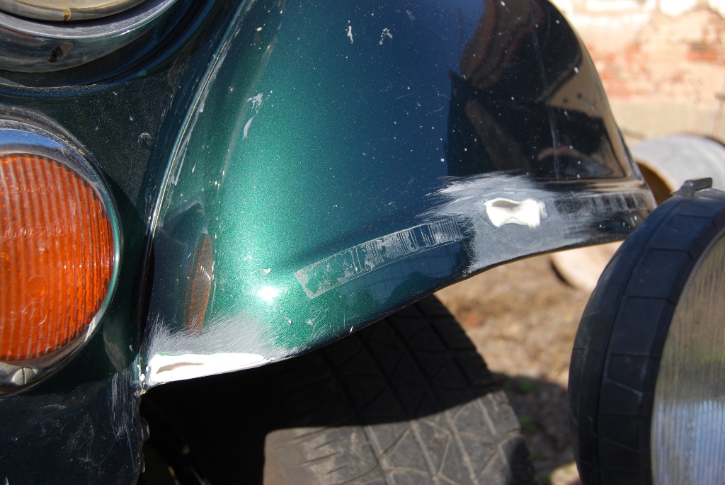 Bruskou jsem si teda pak i obrousil další kousek na karoserii, kde to bylo promáčnuté a co mi narovnal kámoš při poslední návštěvě jeho dílny a vykytoval a vybrousil i tohle místo. Nejhrubší brusný papír jsem používal 60ku a pak postupně snižoval hrubost do hladka. Na fotkách je zatím jen průběh, ještě to je potřeba hodně vyhladit. Měl by na to přijít ještě pak stříkací kyt a teprve pak lak. Ještě je pořeba vybrousit spáry, tam se dá silikon, aby to mohlo pracovat a nepraskalo to. No uvidíme jak to dopadne.