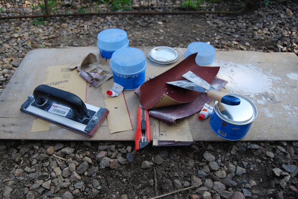 Kamarád automechanik mi doporučil tmel RAPID a ukázal mi postup jak to rozmíchat s tvrdidlem a jak nanášet pomocí stěrky. Nakoupil jsem tedy nezbytný materiál, nástroje a začal. Nejdříve jsem udělal ta místa, co mi kamarád svařil a pak jsem se pustil do toho velkého kusu na blatníku. Zpočátku to vypadalo, že to nikdy nesrovnám do roviny, ale tím hladítkem, co používají řemeslníci na hlazení sádrokartonu, to šlo jedna báseň pěkně brousit. Prkénkem jsem si kontroloval rovinu a postupně zaplňoval prohlubně a zabrušoval výstupky. Snad se mi to podařilo, když jsem se s tím byl ukázat, kamoš říkal, že to dělám dobře, tak to snad bude fajn.