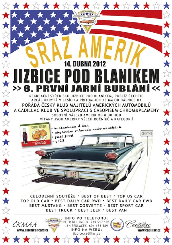 Letos se v rekreačním areálu Jizbice pod Blaníkem sejdeme 14. dubna. Ti nejskalnější příznivci přijedou samozřejmě již v pátek. Cestu a detaily asi nemá cenu vysvětlovat, ale pro ty co praží po detailnějších informacích tu je stránka jizbice.cadillac.cz kde se dozví vše potřebné. A ještě pro pořádek, kdo to pořádá: Český klub majitelů amerických automobilů spolu s Cadillac klubem Česká republika.