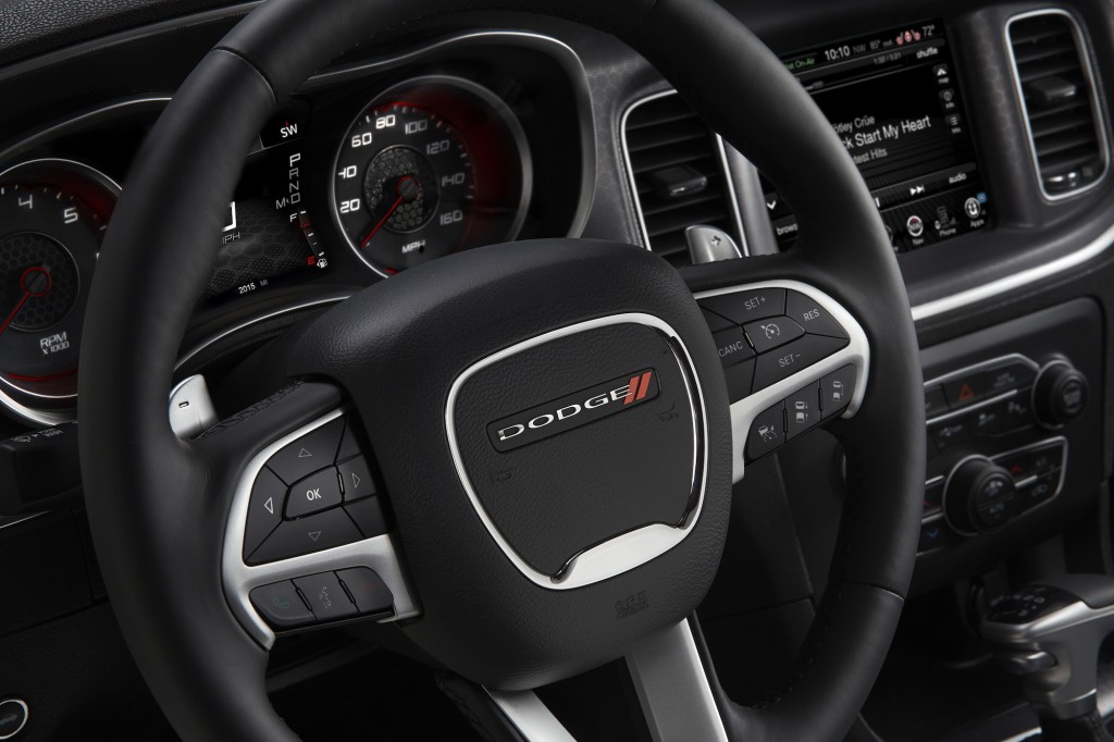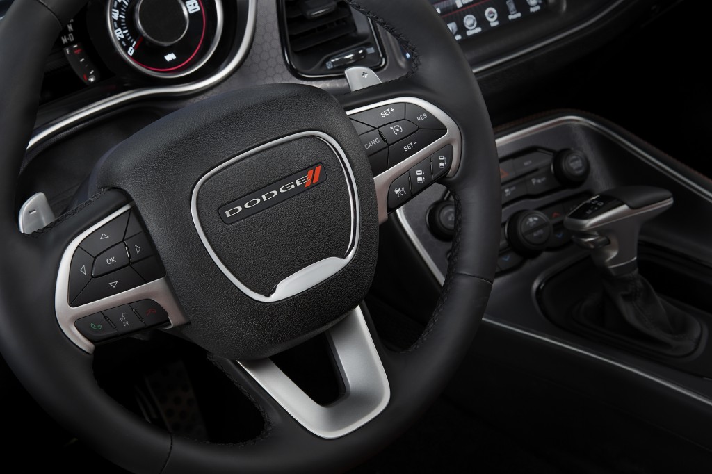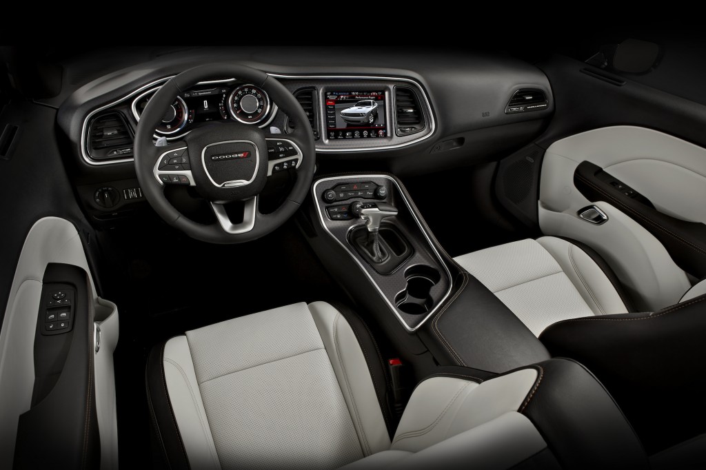 K ještě výraznějším změnám ale došlo v kabině Challengeru. Zatímco modelový rok 2014 měl interiér stále do značné míry založený na původním Dodgi Charger, alias Chrysleru 300C, ze začátku minulé dekády, novinka konečně přebírá interiér z faceliftovaného Chargeru. To znamená příjemnější, modernější design namísto čehosi, co vypadá jako vnitřek plastového autíčka pro děti. Příjemnou změnou je i větší displej infotainmentu, hezkým detailem pro staromilce zase volič automatické převodovky, který připomíná originální „Slapstik“ ze 70. let a “odstínění“ na straně spolujezdce, taktéž podobné originálům. Tím jediným se také Challenger liší od Chargeru, který hraje ještě méně na retro notu a dostal oproti minulému roku jen drobná vylepšení elektroniky.
